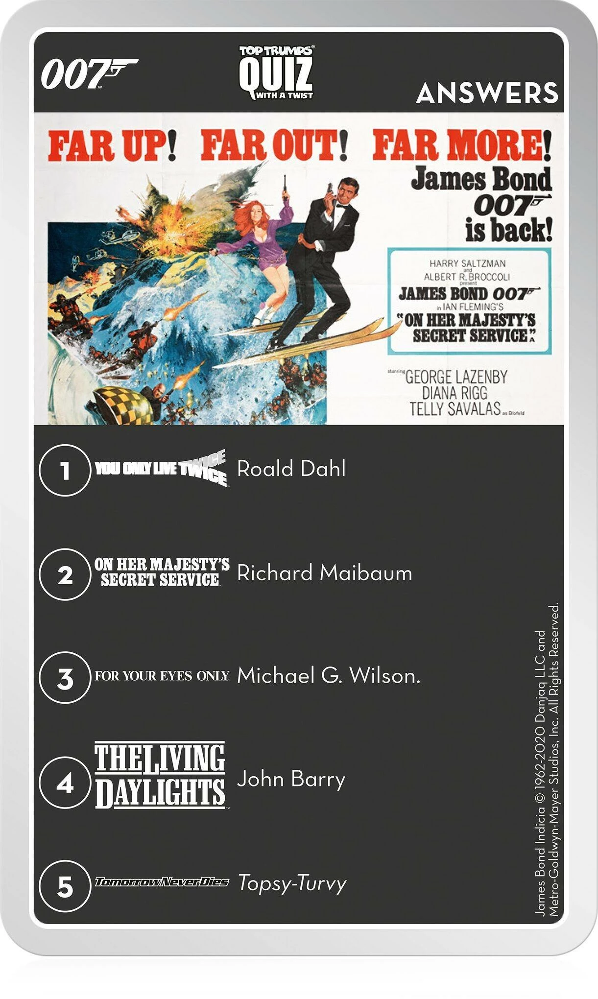 We’re thrilled to introduce TOP TRUMPS QUIZ 007, a brand-new edition of the classic quiz game. Take a chance with 500 questions on all things James Bond, starting with the classic Dr. No and ending with the brand new 2020 release No Time To Die! Think you can remember who sung the title song for Casino Royale, or which Dr. No character had webbed hands? Know who wrote the screenplay for You Only Live Twice, or the the name of the deadly warfare agent from On Her Majesty’s Secret Service?